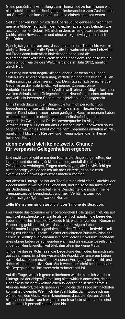 meinem Ableben schlicht in dem gleichen Zustand zu befinden wie auch vor meiner Geburt: Nämlich in dem, eines großen zeitlosen Nichts, ohne Bewusstsein und ohne ein irgendwie geartetes Ich- Empfinden. Sprich, ich gehe davon aus, dass nach meinem Tod nichts von mir übrig bleiben wird als die Spuren, die ich während meiner Lebzeiten auf Erden dann hoffentlich hinterlassen habe, und die Wahrscheinlichkeit eines Weiterlebens nach dem Tod halte ich für ebenso hoch wie die des Weltuntergangs im Jahr 2012, nämlich gleich Null.Dies mag nun sehr negativ klingen, aber auch wenn es auf den ersten Blick so erscheinen mag, vertrete ich doch auf keinen Fall die Auffassung, das Leben sei sinnlos. Denn tatsächlich bereichert der Gedanke an die finale Endlichkeit meines Daseins, ohne Hintertürchen in eine rosarote Wolkenwelt, ohne die Möglichkeit eines zweiten Anlaufs, ohne Gelegenheit zum Neuanfang in einer anderen und vielleicht besseren Sphäre, mein jetziges Leben ungemein. Er hält mich dazu an, den Dingen, die für mich persönlich von Bedeutung sind, wie z.B. Menschen, die mir am Herzen liegen, meiner Kunst oder meinen Tieren genügend Raum in meinem Leben einzuräumen und sie nicht zugunsten selbstauferlegter oder suggerierter Zwänge und Perfektionsansprüche im Alltag zu vernachlässigen. Er gibt mir das Bestreben, allen Lebewesen so zu begegnen wie ich es selbst von meinem Gegenüber erwarten würde, nämlich mit Mitgefühl, Respekt und - wenn notwendig - mit einer helfenden Hand, denn es wird sich keine zweite Chance